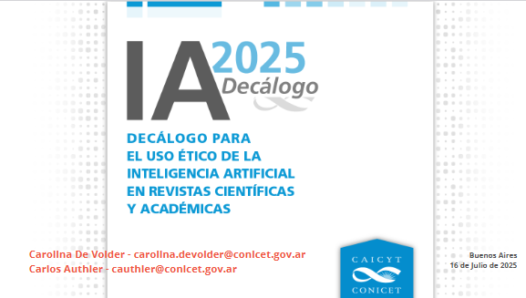 Decálogo para el uso ético de la inteligencia artificial en publicaciones científicas y académicas A partir del avance y expansión de la inteligencia artificial generativa en las actividades vinculadas con la producción y divulgación del conocimiento científico, el CAICYT-CONICET elaboró un decálogo para el uso ético de la inteligencia artificial en revistas científicas y académicas. Compartimos el documento, elaborado por Carolina De Volder y Carlos Authier, para conocer la perspectiva en la que se están posicionando las agencias científicas en nuestro país, en respuesta al crecimiento vertiginoso de estas tecnologías en el ámbito de la investigación. |